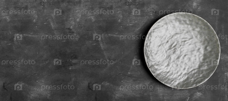 Пустая серая текстурированная тарелка на темно-сером деревянном фоне. Минимальное изображение. Баннер. Вид сверху. Скопируйте пространство