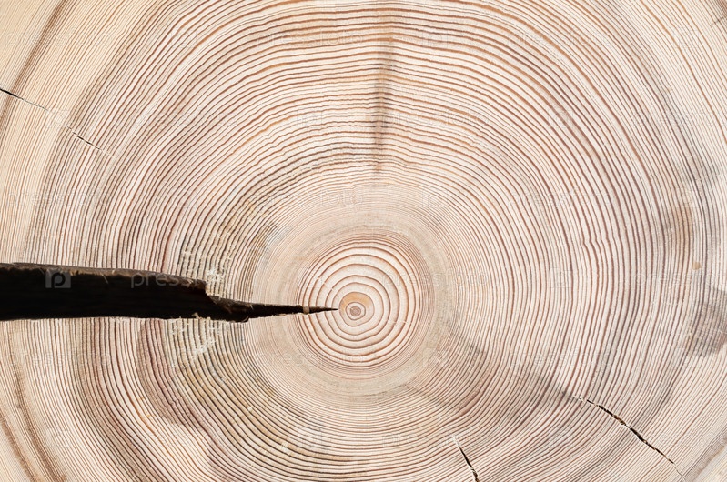 Поперечный срез натурального дерева с крупной трещиной. Текстура древесины с годовыми кольцами. Абстрактный натуральный деревянный текстурированный фон. Вид сверху. Закрыть