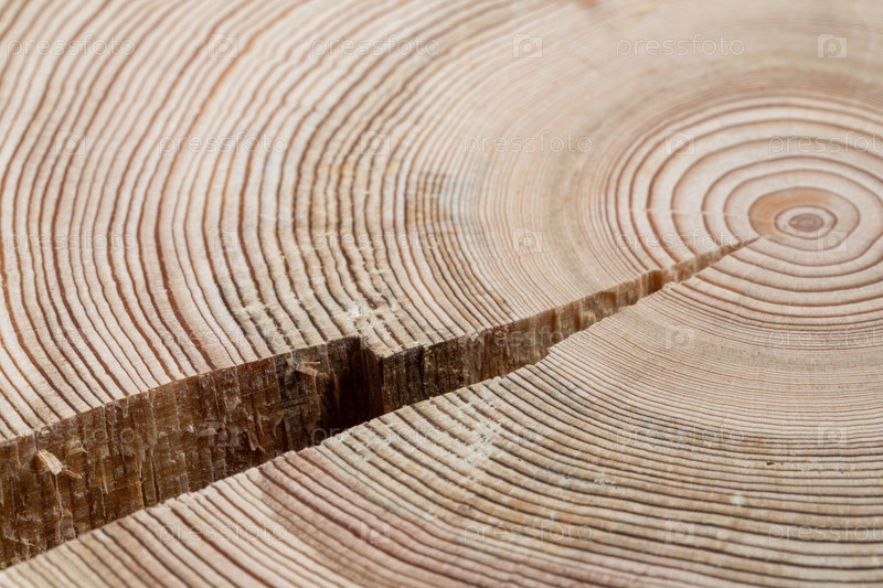 Большая трещина сухого натурального деревянного поперечного среза крупным планом. Текстура древесины с трещиной и годовыми кольцами. Абстрактный натуральный деревянный текстурированный фон. Горизонтальная ориентация. Выборочный фокус