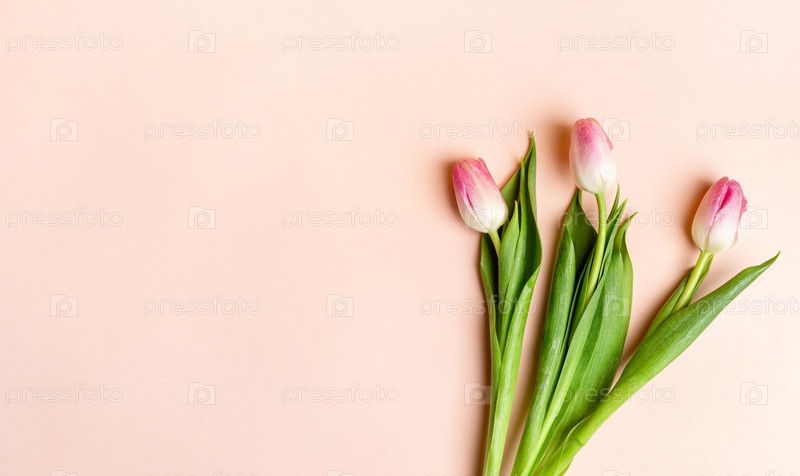 Три свежих розовых тюльпана на пастельно-розовом фоне с копией пространства для текста. Весенний фон. Праздничная открытка. Открытка на день матери. Горизонтальная ориентация