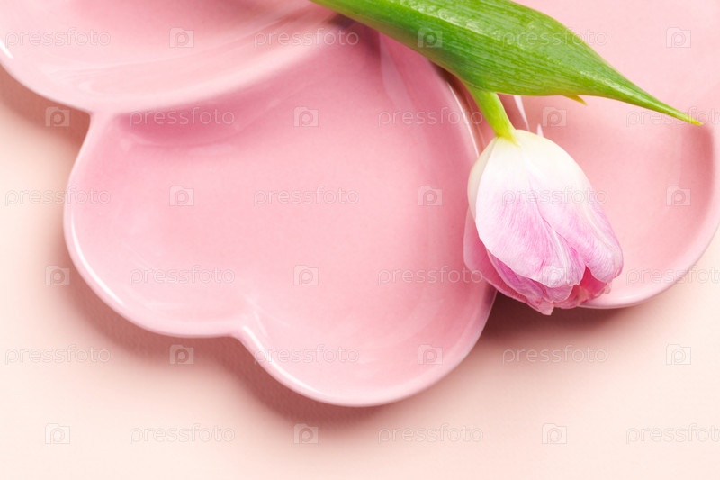 Сервировка весеннего стола - пустая розовая тарелка в форме сердца и розовый тюльпан крупным планом на пастельно-розовом