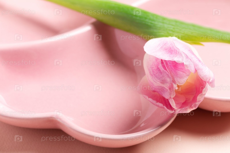 Закройте пустую розовую тарелку в форме сердца с розовым тюльпаном на пастельно-розовом фоне. Праздничный макет. День матери, образ дня святого Валентина. Весенняя сервировка стола. Скопируйте место для текста