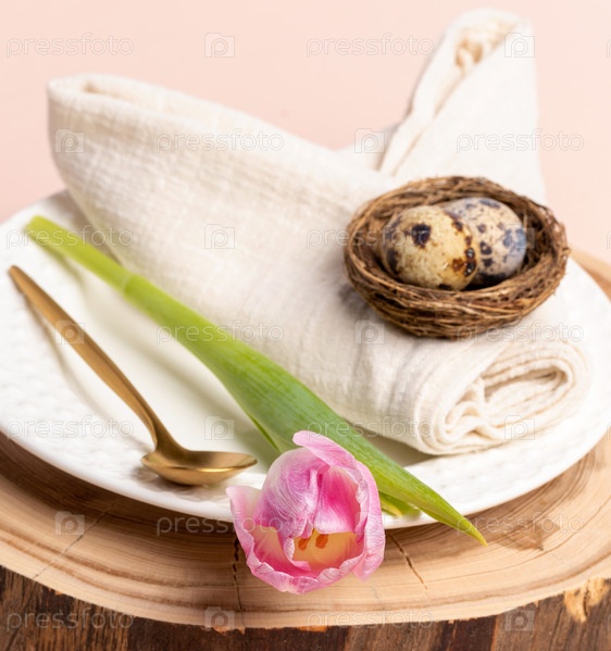 Перепелиные яйца на хлопчатобумажной салфетке, свернутой в кроличьи уши, белая тарелка, золотая ложка, тюльпан на деревянной подставке