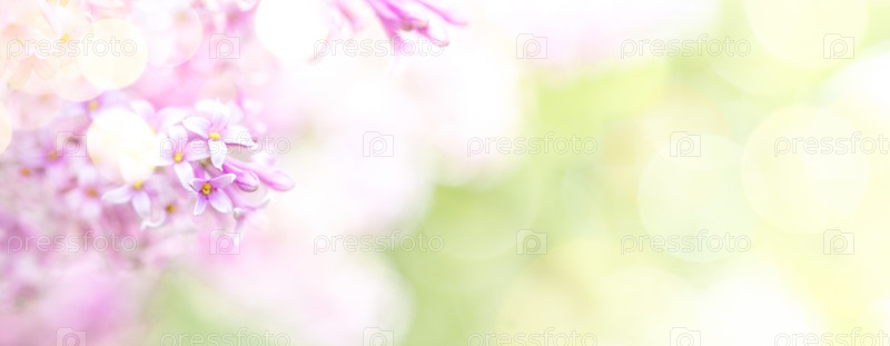 Широкий весенний цветущий баннер. Розовые цветы сирени с боке огни на размытом фоне листвы