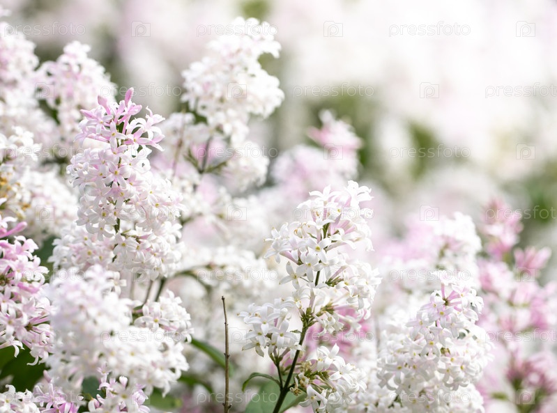 Красивый весенний фон с ветвями цветущей бело-розовой сирени на переднем плане