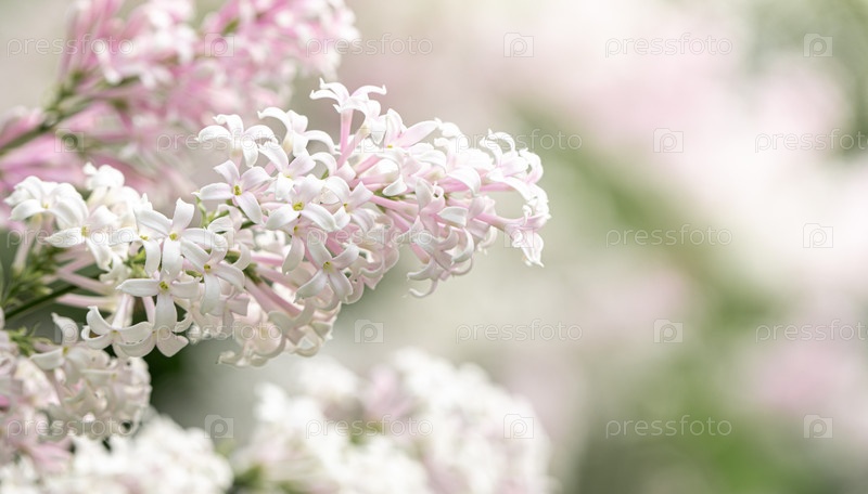 Красивая бело-розовая весенняя цветущая ветка сирени на размытом фоне. Цветущие цветы дерева сиринги весной. Красота в природе. Весенний фон. Выборочный фокус. Закрыть пространство для копирования