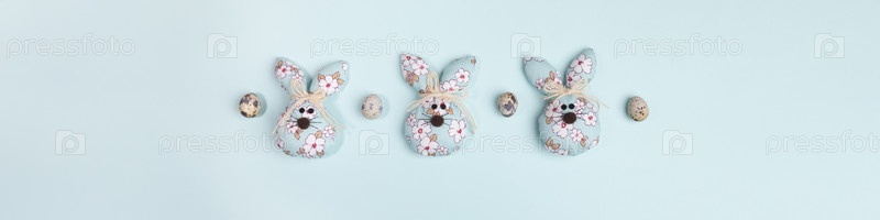 Пасхальный баннер с цыганскими яйцами и текстильными пасхальных кроликов DIY в центре пастельного светло-синего цвета с копией пространства для текста