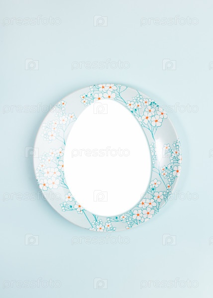 Пасхальный креативный праздничный минималистичный макет с копировальным пространством в форме яйца на тарелке в центре голубого фона