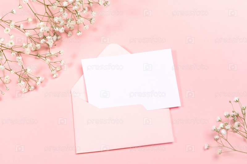 Пастельно-розовый праздничный макет с конвертом, пустым листом, белыми цветами гипсофилы. Скопируйте место для текста. Макет