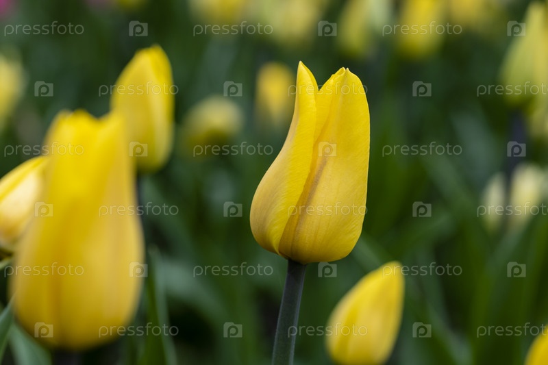 Один желтый тюльпан на зеленом фоне, первые весенние цветы, первоцветы, весна