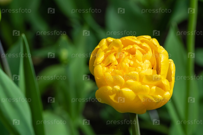 Яркий красивый желтый тюльпан, крупный план тюльпана махрового пиона, роскошные цветки сада