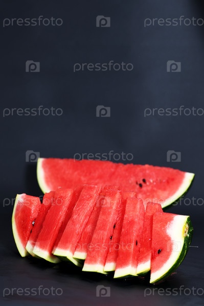 Нарежьте кусочки красного спелого вкусного сочного арбуза на черном фоне крупным планом