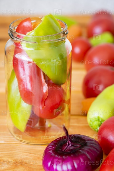 Овощи готовят для консервации в стеклянной банке крупным планом. Маринованные овощи, овощная закуска