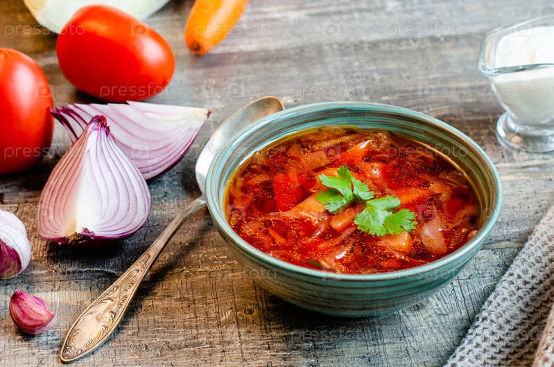 Борщ - традиционное блюдо украинской русской славянской кухни, овощной суп в мясном бульоне, тарелка борща и ингредиенты на сером деревянном столе