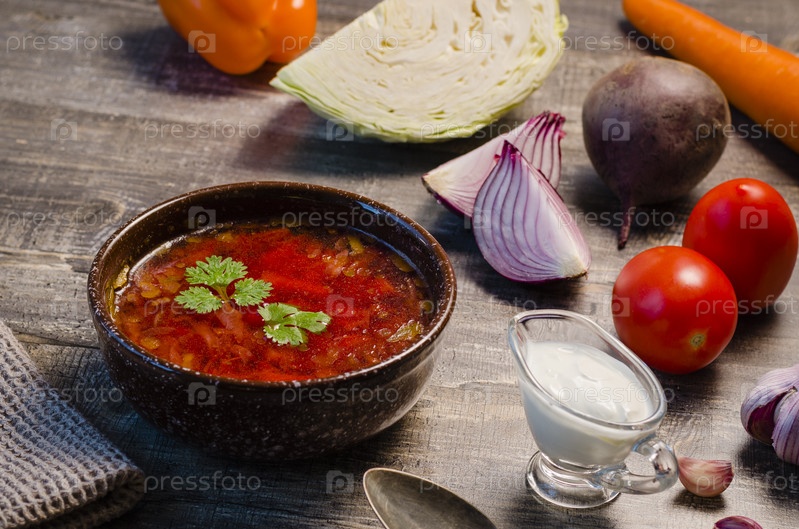 Борщ - традиционное блюдо украинской русской славянской кухни, овощной суп в мясном бульоне, керамическая коричневая тарелка борща и ингредиенты на сером деревянном столе