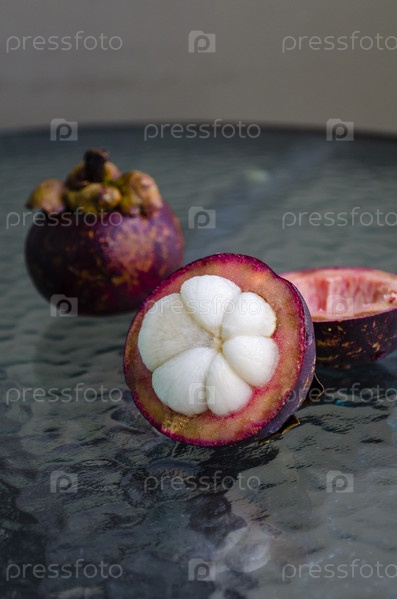 Мангостин на стеклянном столе крупным планом. Фруктовая королева Таиланда – мангустин. азиатские фрукты