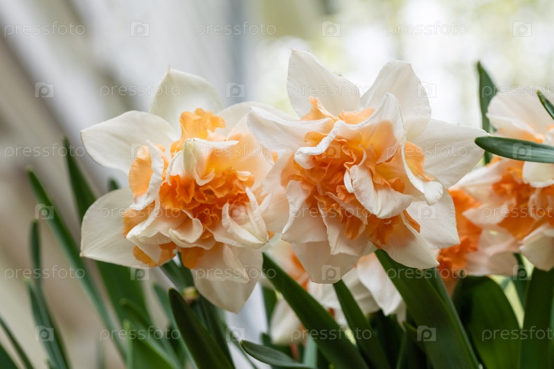 Красивые желтые и белые махровые нарциссы крупным планом