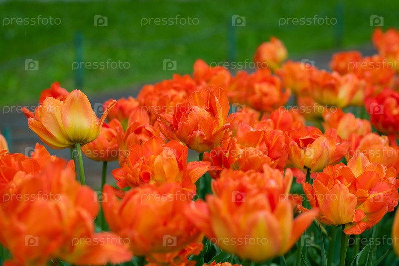 Красивые огненно-красные махровые тюльпаны крупным планом селективный фокус. цветочный огонь