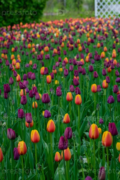 Весеннее поле красивых разноцветных тюльпанов. Фестиваль тюльпанов на Елагином острове в Центральном парке культуры и отдыха имени С.М.Кирова