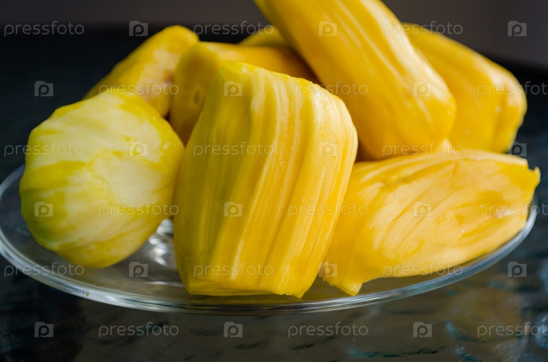 Джекфрут, спелые сочные ароматные вкусные ярко-желтые очищенные плоды индийского хлебного дерева на стеклянном столе