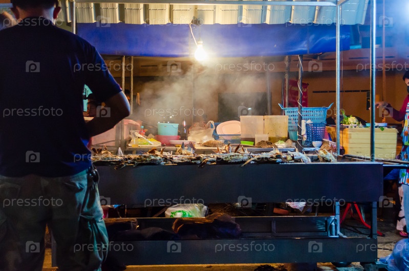 Барбекю с жареной морской рыбой на углях на рынке начес в Паттайе, Таиланд. Сибас, приготовленный вечером на углях, тайская уличная еда на открытом фуд-корте