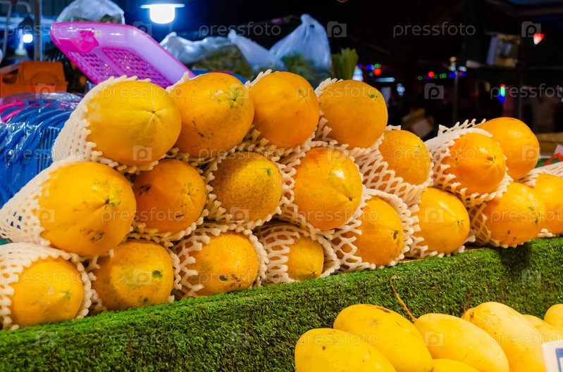 Экзотические свежие тайские фрукты на ночном рынке в Паттайе, Таиланд: папайя и манго