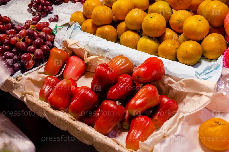 Экзотические свежие сочные вкусные тайские фрукты на ночном рынке в Паттайе, Таиланд: розовое яблоко, мандарины, апельсины, виноград