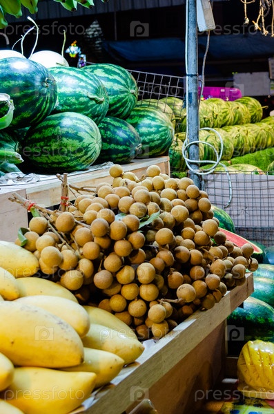 Экзотические свежие тайские фрукты на ночном рынке в Паттайе, Таиланд: папайя, драконий фрукт, маракуйя, манго, арбузы, бананы, ананасы, лонган, личи