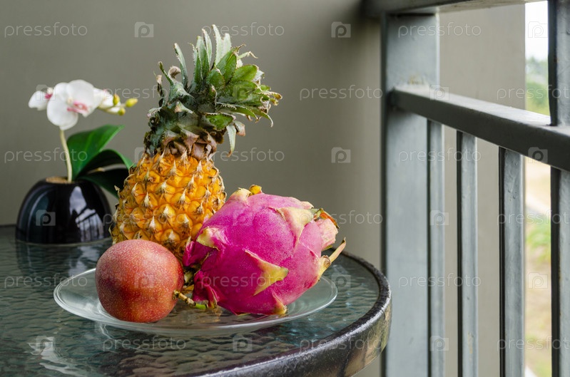 Тайские экзотические фрукты ананас, драконий фрукт, маракуйя на стеклянном столе крупным планом