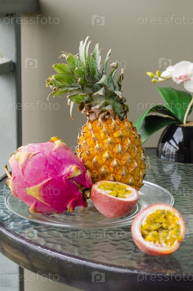Тайские экзотические фрукты ананас, драконий фрукт, маракуйя на стеклянном столе крупным планом