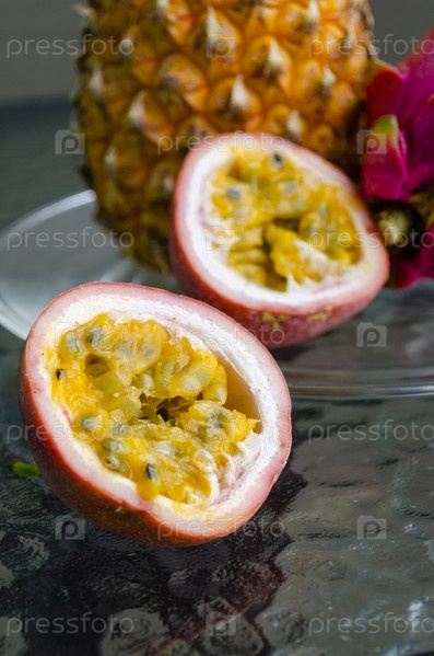 Разрежьте пополам спелые сочные маракуйи крупным планом. Экзотические тропические вкусные тайские фрукты маракуйя ананас драконий фрукт на стеклянном столе