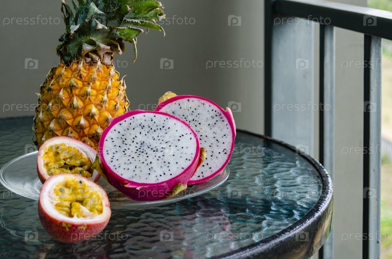 Разрезанный пополам маракуйя и драконий фрукт крупным планом