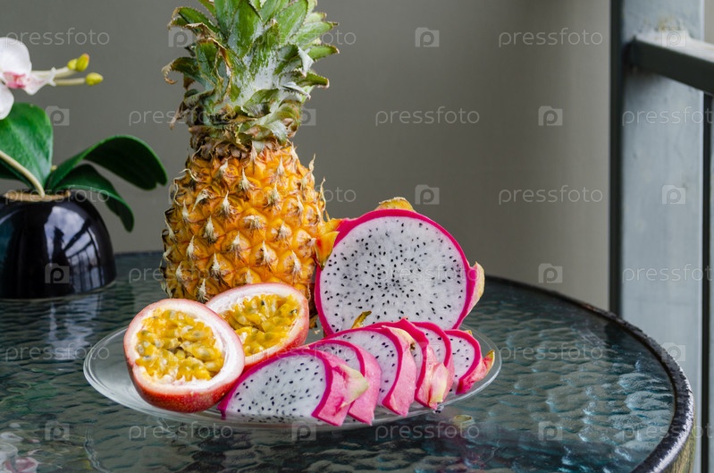 Нарезанный драконий фрукт и маракуйя крупным планом. Экзотические тропические вкусные тайские фрукты маракуйя ананас драконий фрукт на стеклянном столе