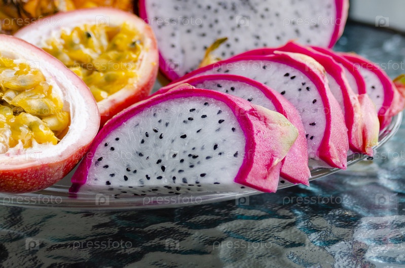 Нарезанный драконий фрукт и маракуйя крупным планом. Экзотические тропические вкусные тайские фрукты маракуйя ананас драконий фрукт на стеклянном столе