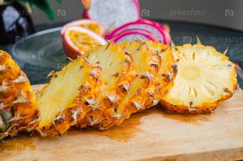 Круглый нарезанный ананас на крупном плане деревянной доски. Экзотические тропические вкусные тайские фрукты маракуйя ананас драконий фрукт на стеклянном столе