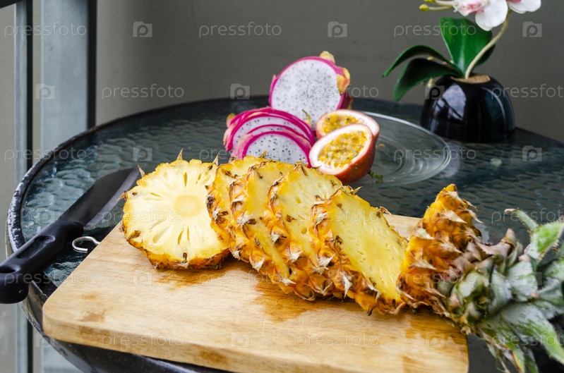 Круглый нарезанный ананас на крупном плане деревянной доски. Экзотические тропические вкусные тайские фрукты маракуйя ананас драконий фрукт на стеклянном столе
