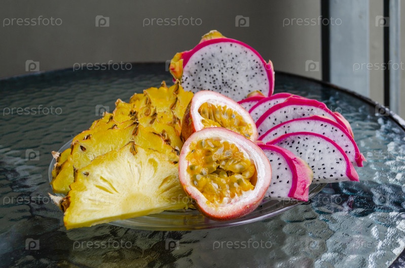 Нарезанные вкусные сочные спелые тропические фрукты крупным планом. Экзотические тропические вкусные тайские фрукты маракуйя ананас драконий фрукт на стеклянном столе