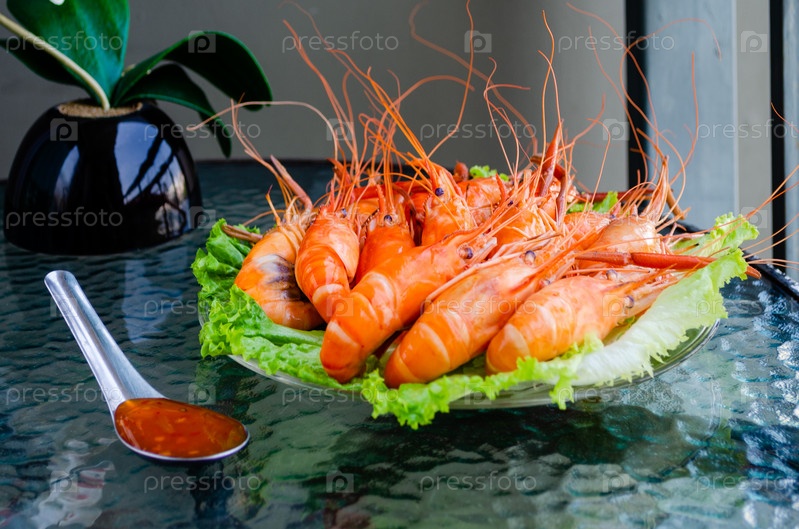 Вареные вкусные королевские креветки на зеленых листьях салата с тайским кисло-сладким соусом на стеклянном столе