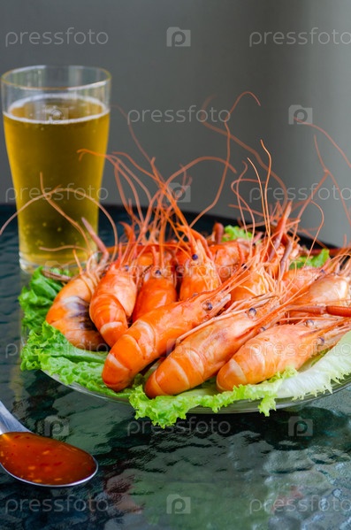 Вкусные огромные вареные королевские креветки, стакан пива и острый соус на стеклянном столе