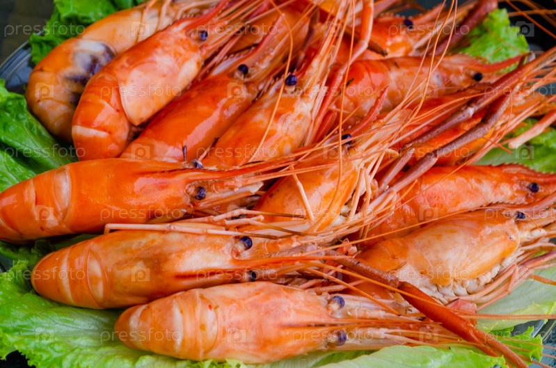 Вареные вкусные королевские креветки на зеленых листьях салата с тайским кисло-сладким соусом на плоском стеклянном столе