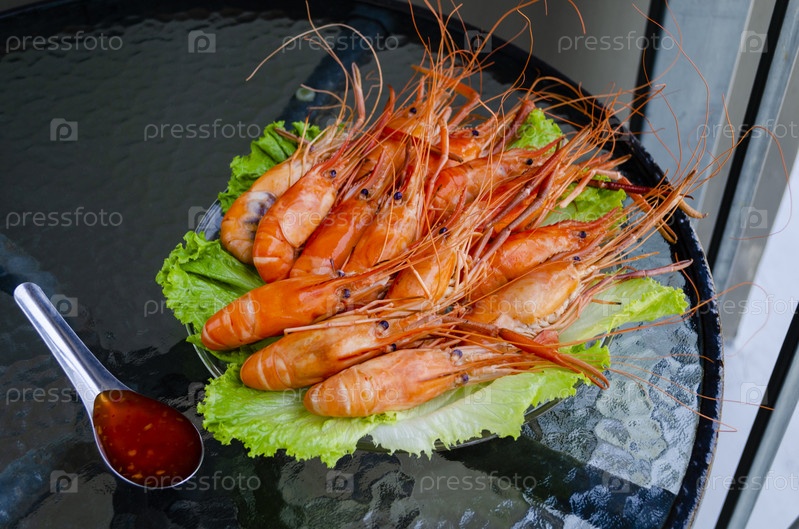 Вареные вкусные королевские креветки на зеленых листьях салата с тайским кисло-сладким соусом на стеклянном столе. Крупный план креветок из морепродуктов