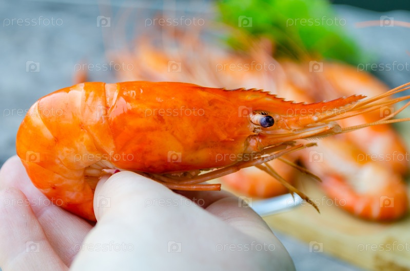 Большая вареная королевская креветка в женской руке крупным планом