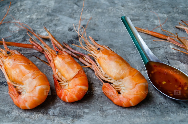 Огромные вареные вкусные королевские креветки на сером фоне крупным планом, плоская планировка, пространство для копирования