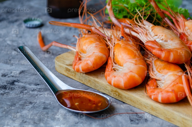 Большие вареные королевские креветки с острым тайским соусом крупным планом, выборочный фокус