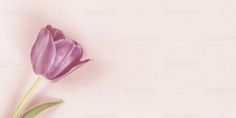 Один розовый тюльпан на пастельном нейтральном фоне. Минимальный ретро тонированный весенний праздничный цветочный баннер. Ретро тонировка. День святого Валентина, День матери, поздравительная открытка на женский день. Вид сверху, пространство для копиров