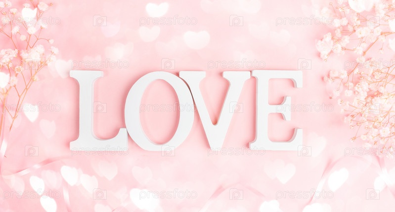 Белые буквы LOVE с рамкой из нежного белого гипсофила на пастельно-розовом фоне со стороны светящимися сердцами