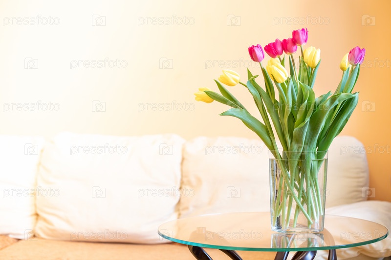 Тюльпаны в вазе на стеклянном столе в гостиной с диваном. 8 марта, день рождения, концепция Дня святого Валентина