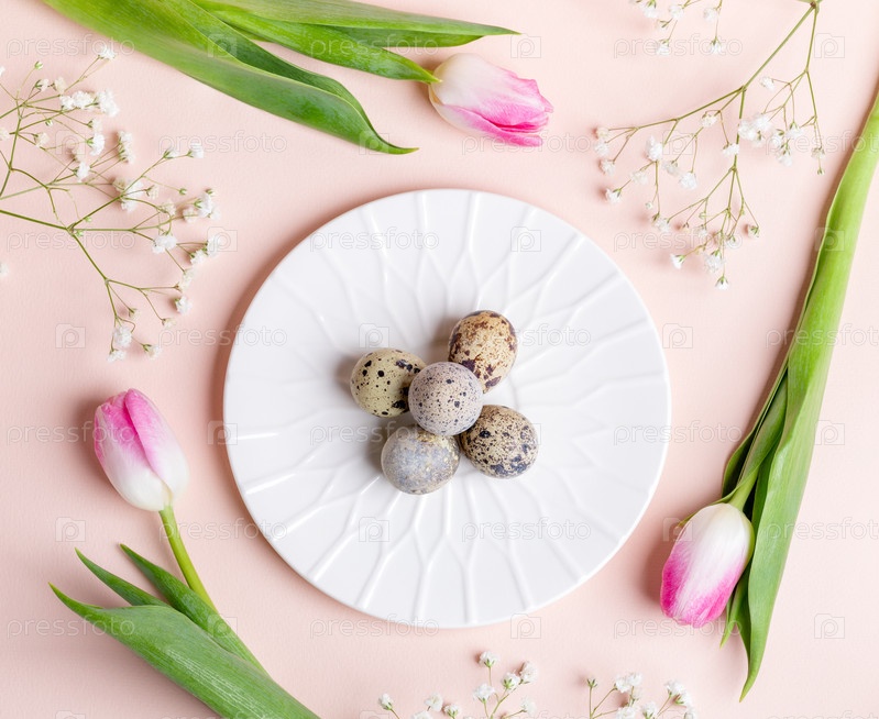 Пасхальная плоская планировка перепелиных яиц на белой тарелке с тюльпанами и цветами гипсофилы вокруг нее на пастельно-розовом фоне. Праздничные украшения. Весенняя открытка. Вид сверху
