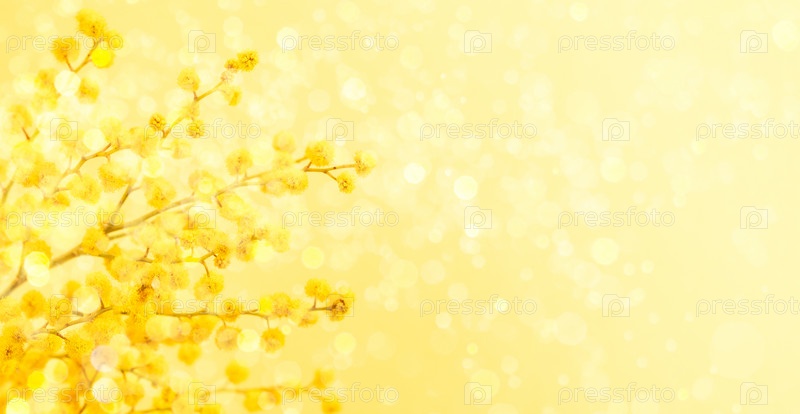 8 марта или пасхальная открытка с желтой веткой мимозы на желтом фоне с огнями боке
