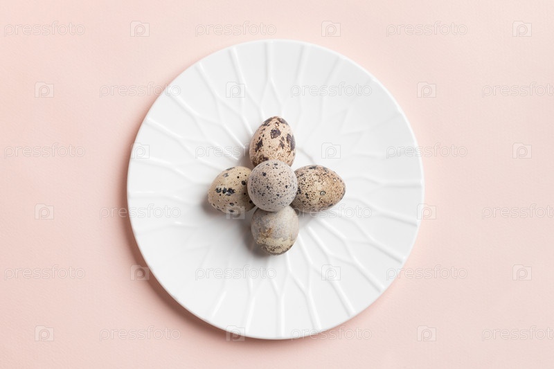 Минимальное пасхальное изображение с перепелиными яйцами, выложенными крестом на белой тарелке на пастельно-розовом фоне. Весенняя открытка. Скопируйте пространство. Вид сверху, плоская планировка. Горизонтальная ориентация